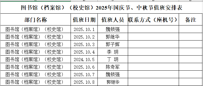 图书馆(档案馆)(校史馆)2025年国庆节、中秋节值班安排表